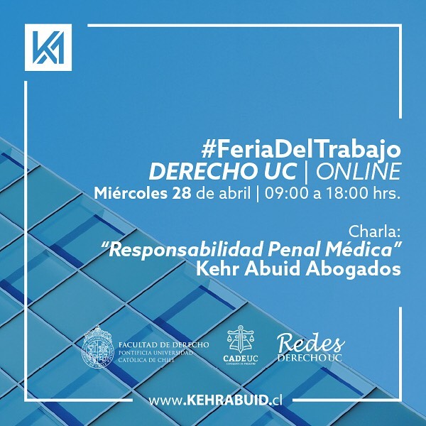Este miércoles 28 de abril, nos encontraremos en la Feria del Trabajo #Derecho UC donde podrán ver una #charla #online realizada por nuestros socios, Juan César Kehr y Omar Andrés Abuid, sobre Responsabilidad Penal Médica.